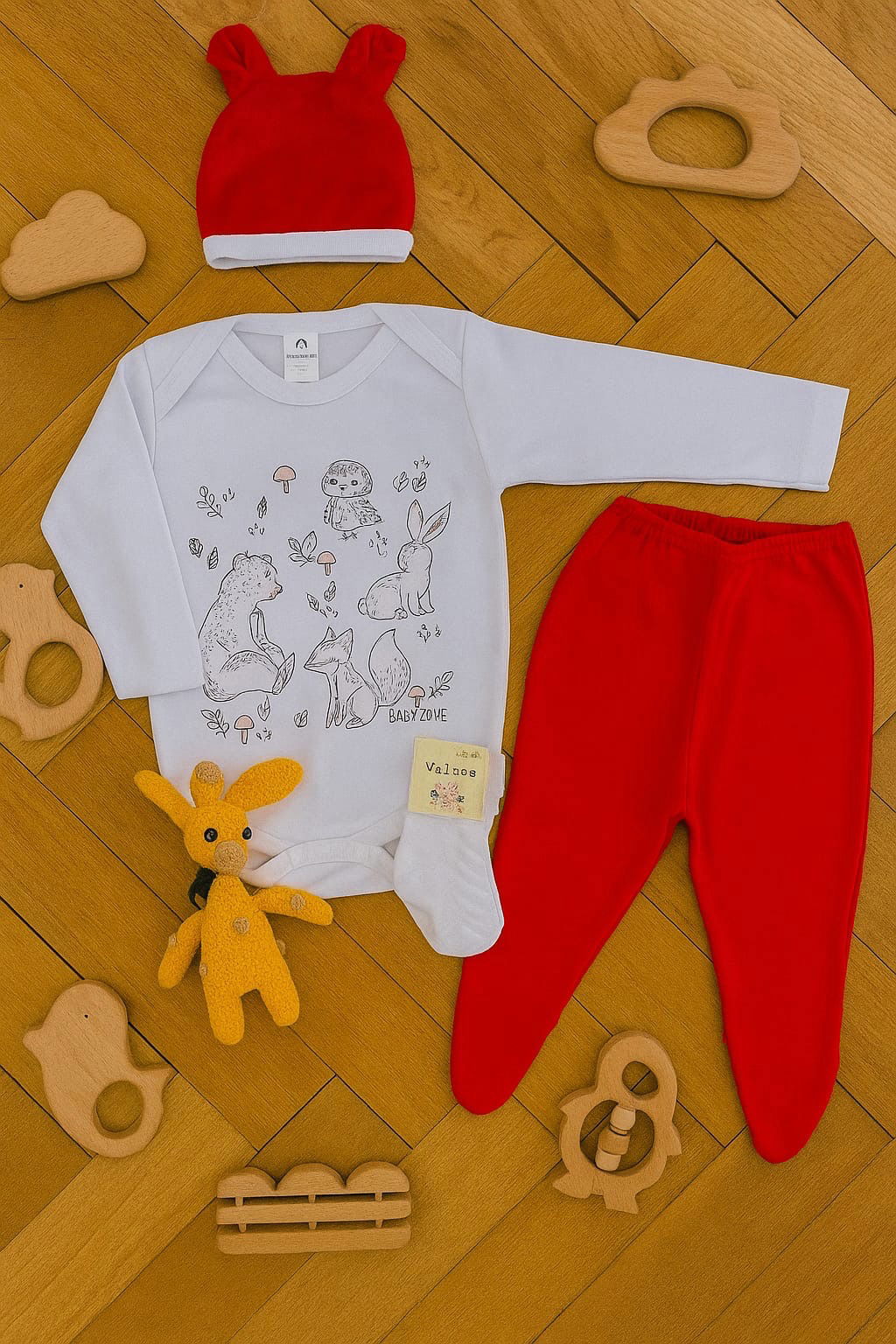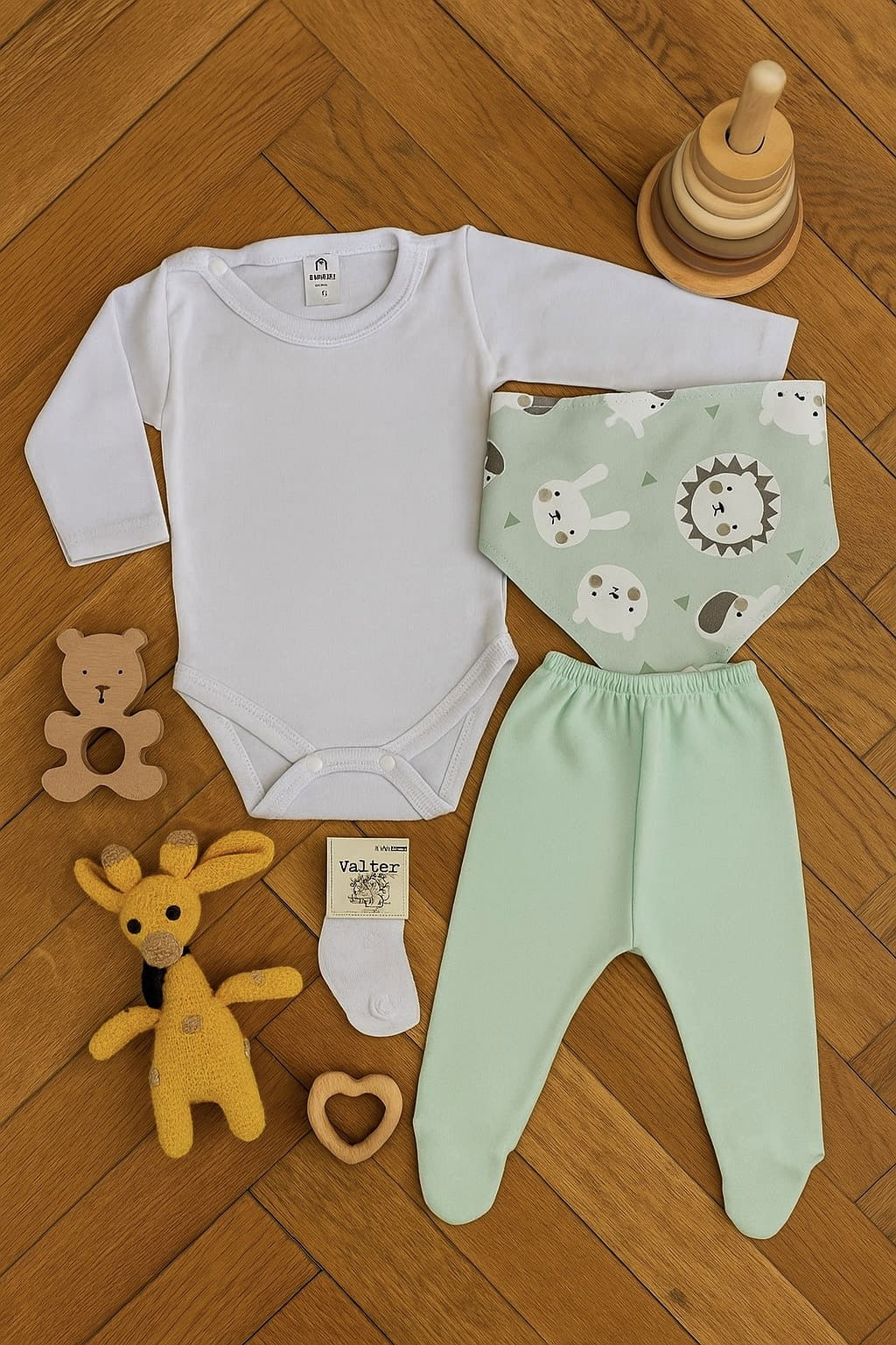 Body algodón + gorrito plush + babero bandana + ranita algodón + medias
