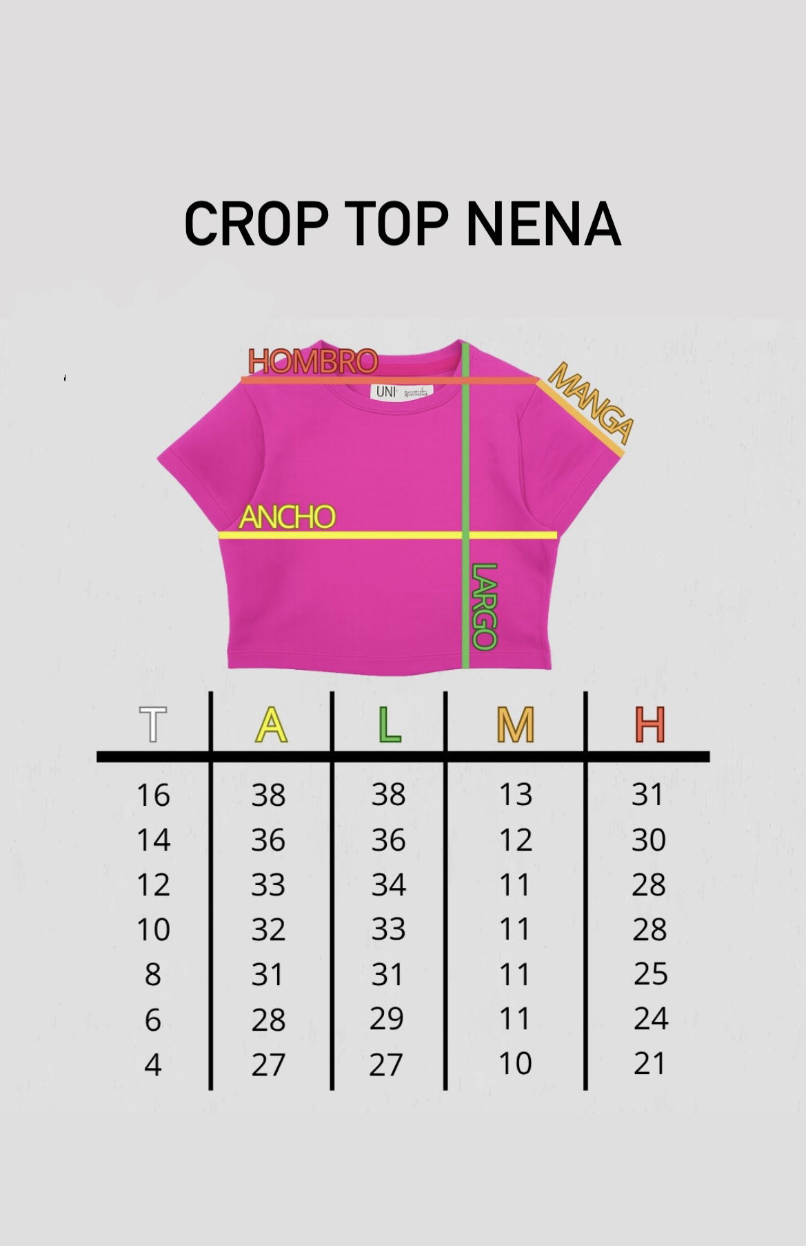 - Guía de talles: Podés utilizarla para comparar con las medidas de alguna prenda de tu peque. Al tratarse de prendas con procesos manuales puede haber una mínima diferencia entre el producto y la tabla.