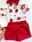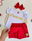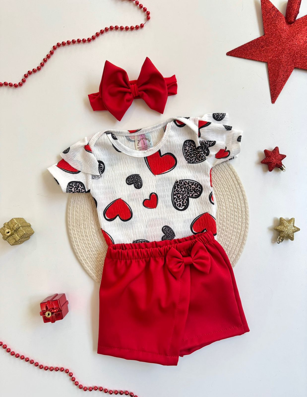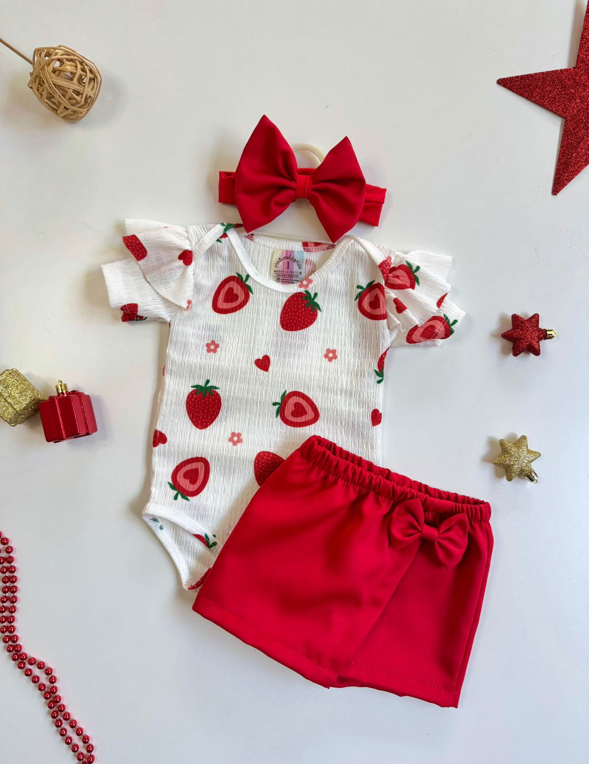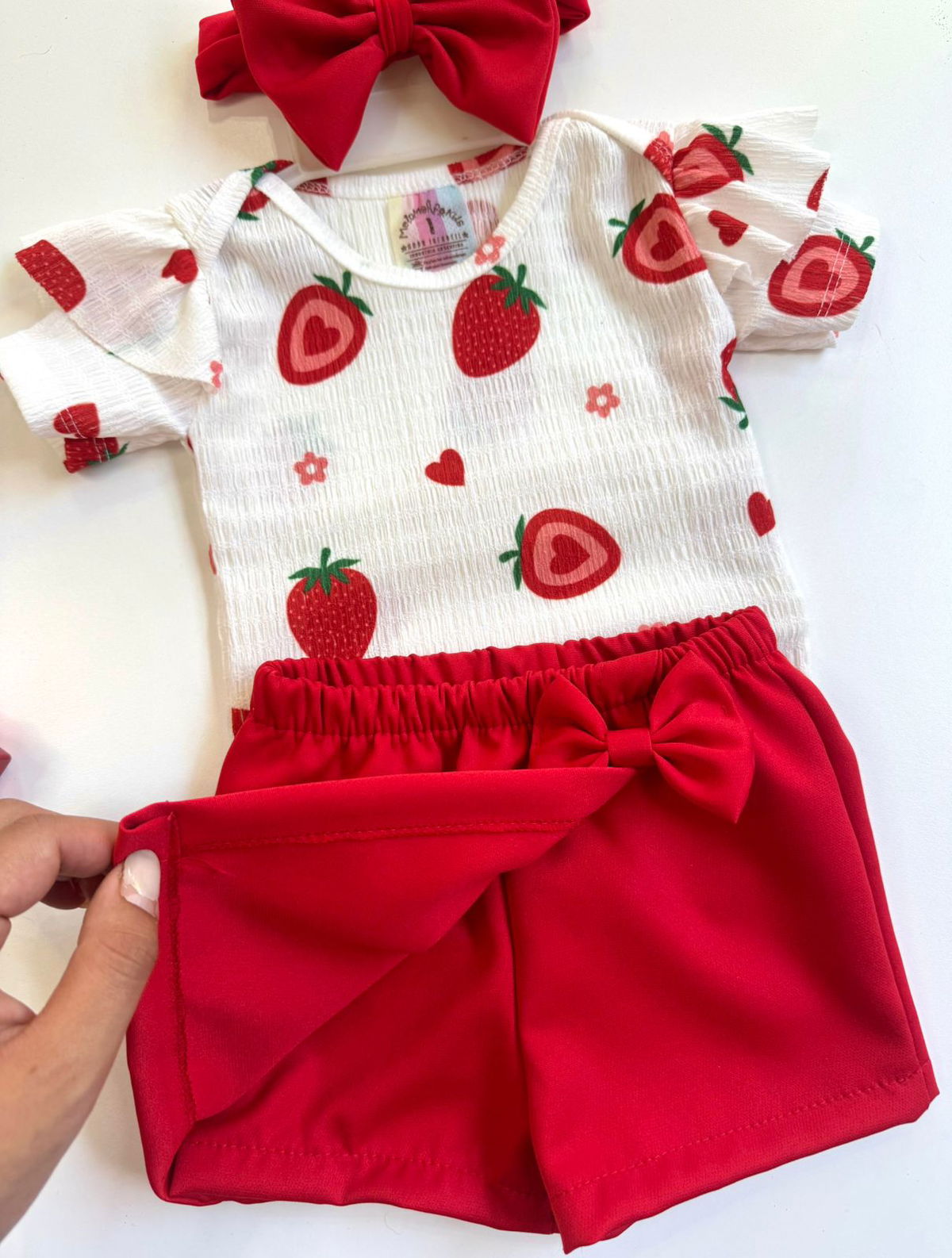 Body frutilla y corazón confeccionados en tela hawai y Body princesa confeccionado en tela algodon + Shortpollera sastrero y vincha al tono.
