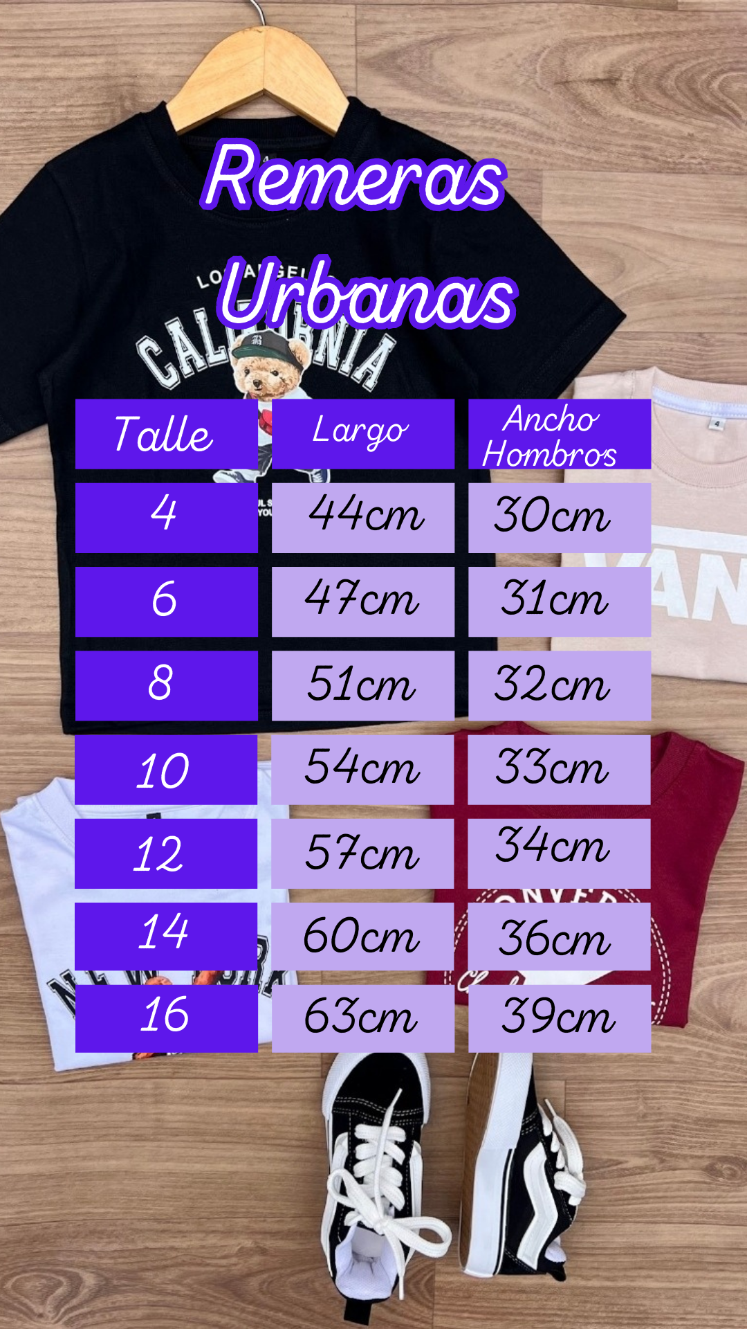 - Guía de talles: Podés utilizarla para comparar con las medidas de alguna prenda de tu peque. Al tratarse de prendas con procesos manuales puede haber una mínima diferencia entre el producto y la tabla.