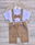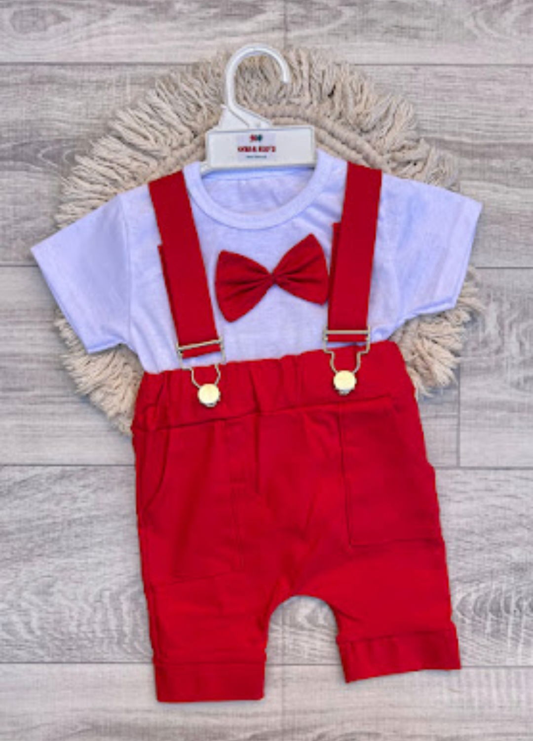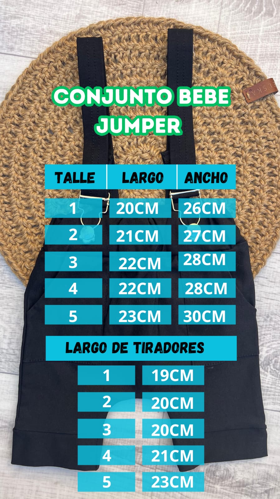 Jumper con tiradores confeccionado en bengalina elastizada. Súper cómodo para el bebé. Combinado con remera lisa de algodón con moño ya fijado a la misma.